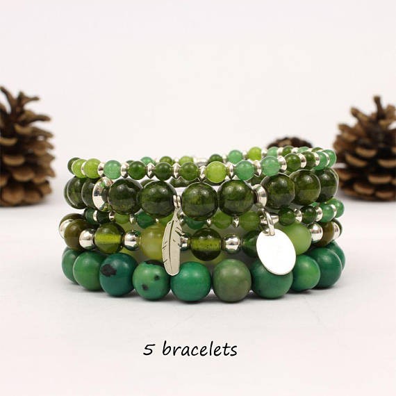 5 Bracelets : 1 bracelet jade plume, 2 bracelets jade fin, 1 bracelet graine d'açai, et 1 bracelet mélange de vert.